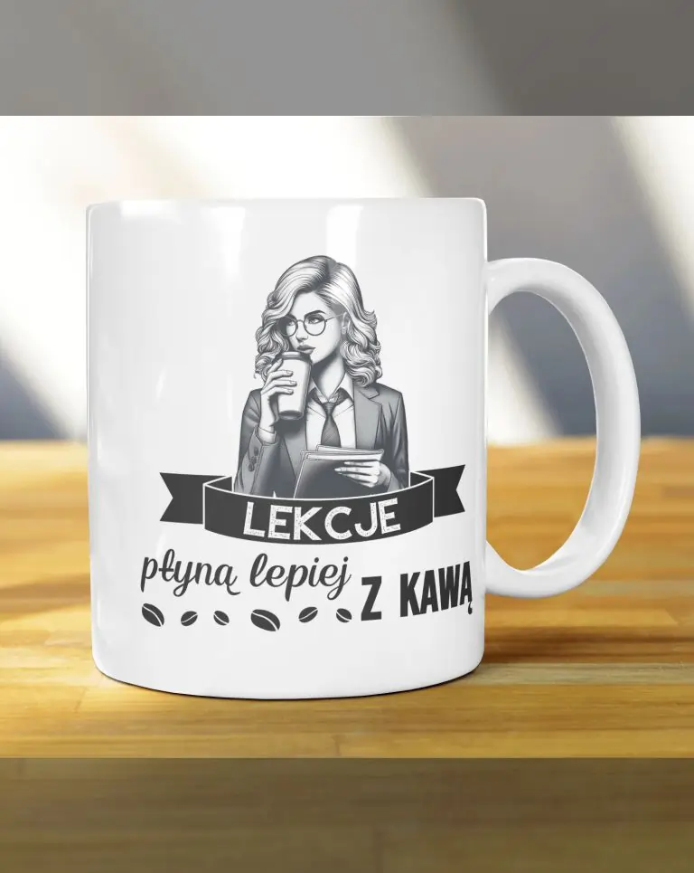 Pamiątkowy kubek dla ucznia/studenta/nauczyciela z nadrukiem na prezent / upominek – Lekcje płyną lepiej z kawą