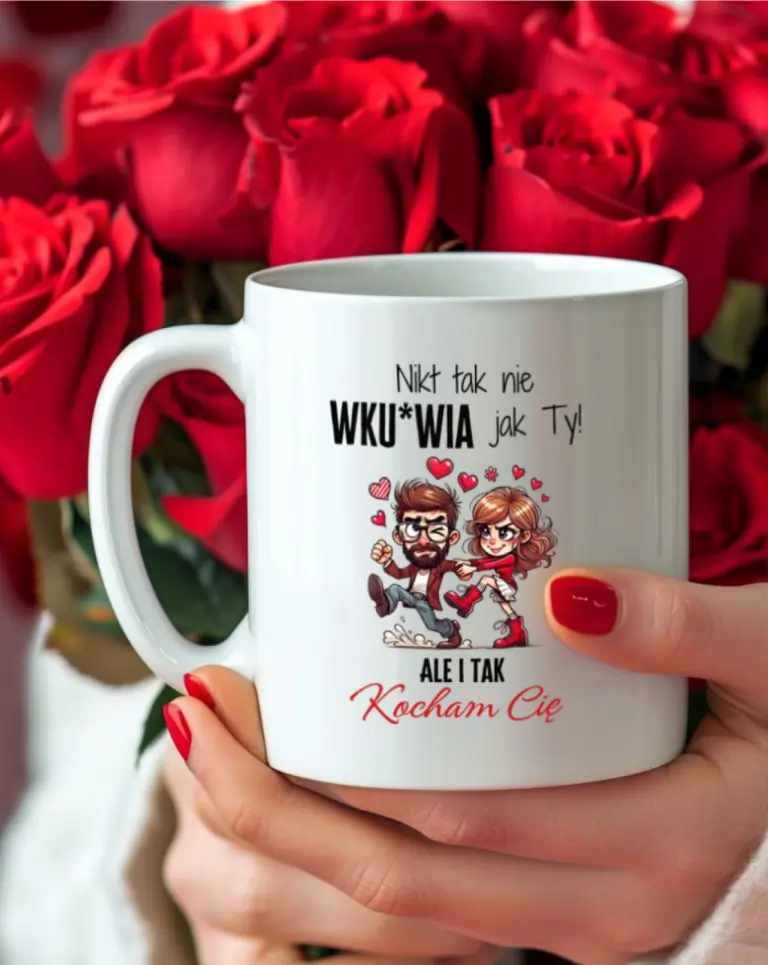 Kubek „Nikt tak nie wku*wia jak Ty, ale i tak Kocham Cię!” to zabawny i szczery prezent na Walentynki, który doskonale oddaje dynamikę relacji pełnej miłości, śmiechu i drobnych irytacji. Ten kubek świetnie sprawdzi się jako upominek dla osoby, z którą dzielisz wspólne chwile – zarówno te pełne radości, jak i te pełne drobnych, ale uroczych kłótni. Wykonany z wysokiej jakości ceramiki, będzie doskonałym towarzyszem codziennych napojów, przypominając o uczuciach, które łączą Was każdego dnia.