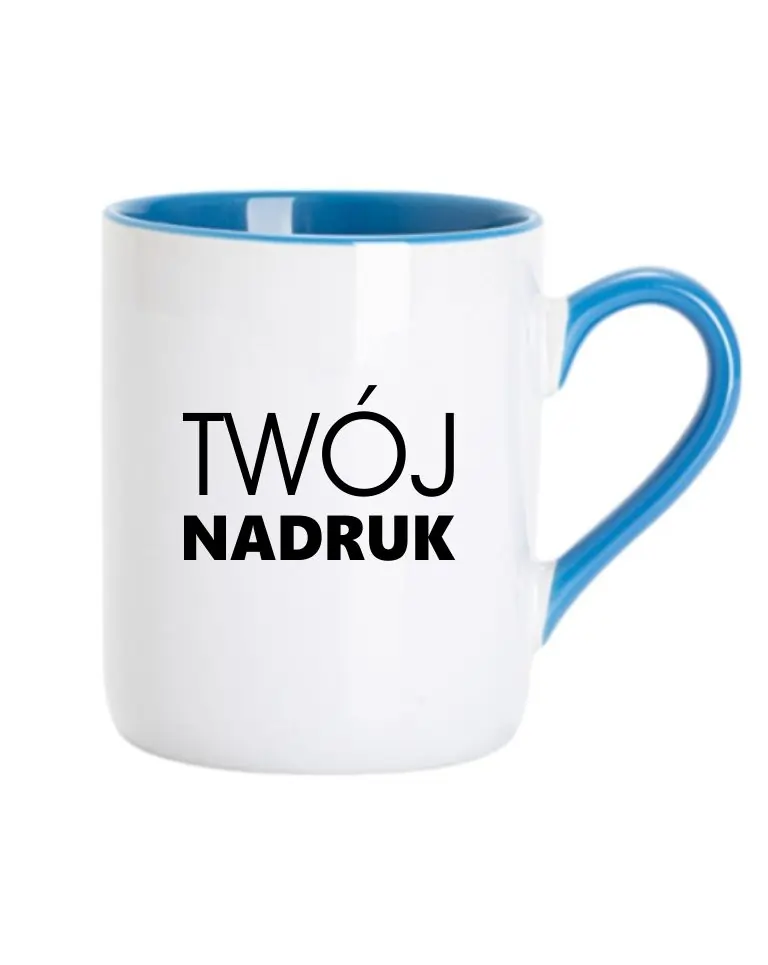 Biały kubek z błękitnym wnętrzem i uszkiem – z Twoim własnym nadrukiem.