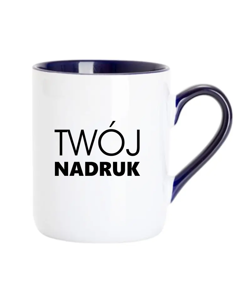 Biały kubek z granatowym wnętrzem i uszkiem – z Twoim własnym nadrukiem.