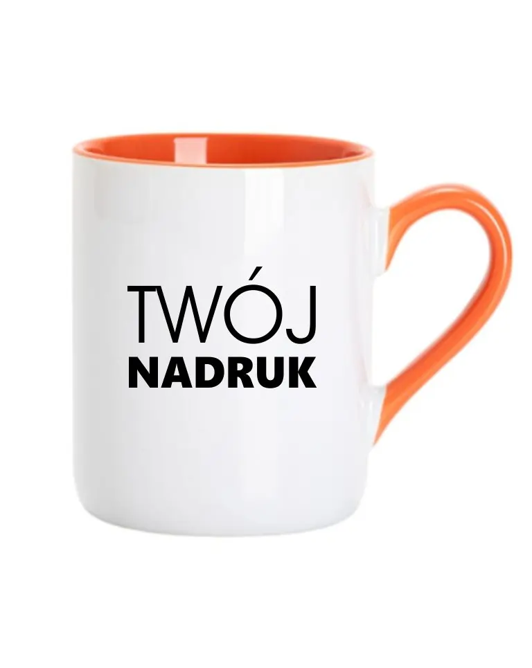 Biały kubek z pomarańczowym wnętrzem i uszkiem – z Twoim własnym nadrukiem.